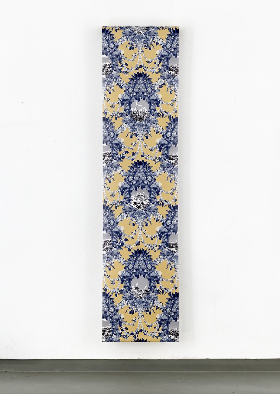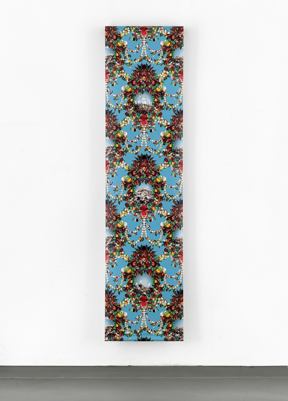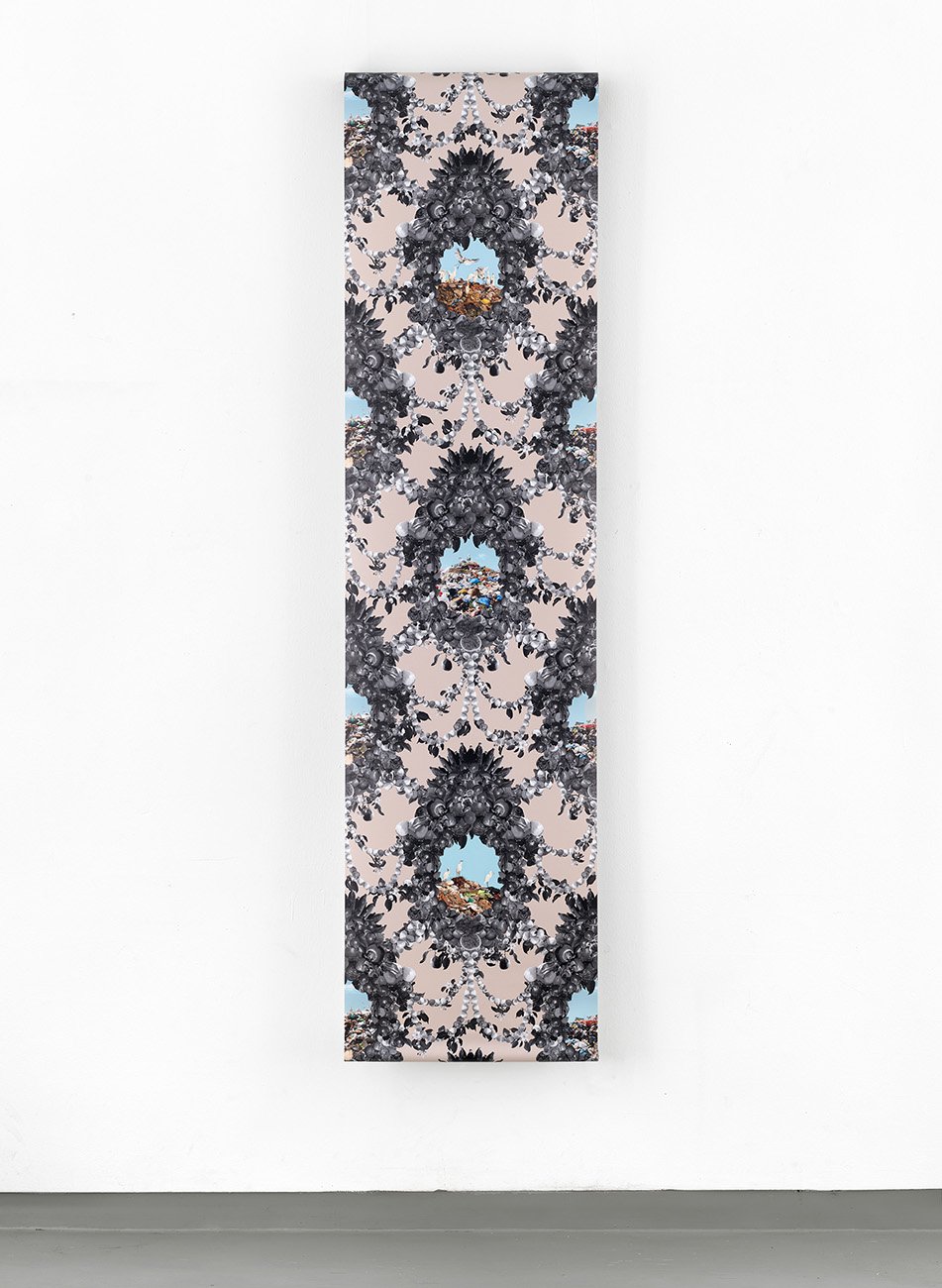 The design draws on Baroque wallpaper. A wreath of fruit, blossoms, and leaves—tied together with cords of oranges and lemons—appears alluring at first, yet up close reveals traces of decay and rot. Baroque ornament built from spoiled fruit sits alongside small vignettes of waste-disposal sites, with vultures circling above. Instead of offering the visual comfort of what Duchamp called “retinal art,” the pattern folds abundance and deterioration into a single plane. Its contrasts point to a broader tension: the excess of food produced for human consumption and the decadence fueled by contemporary capitalism.