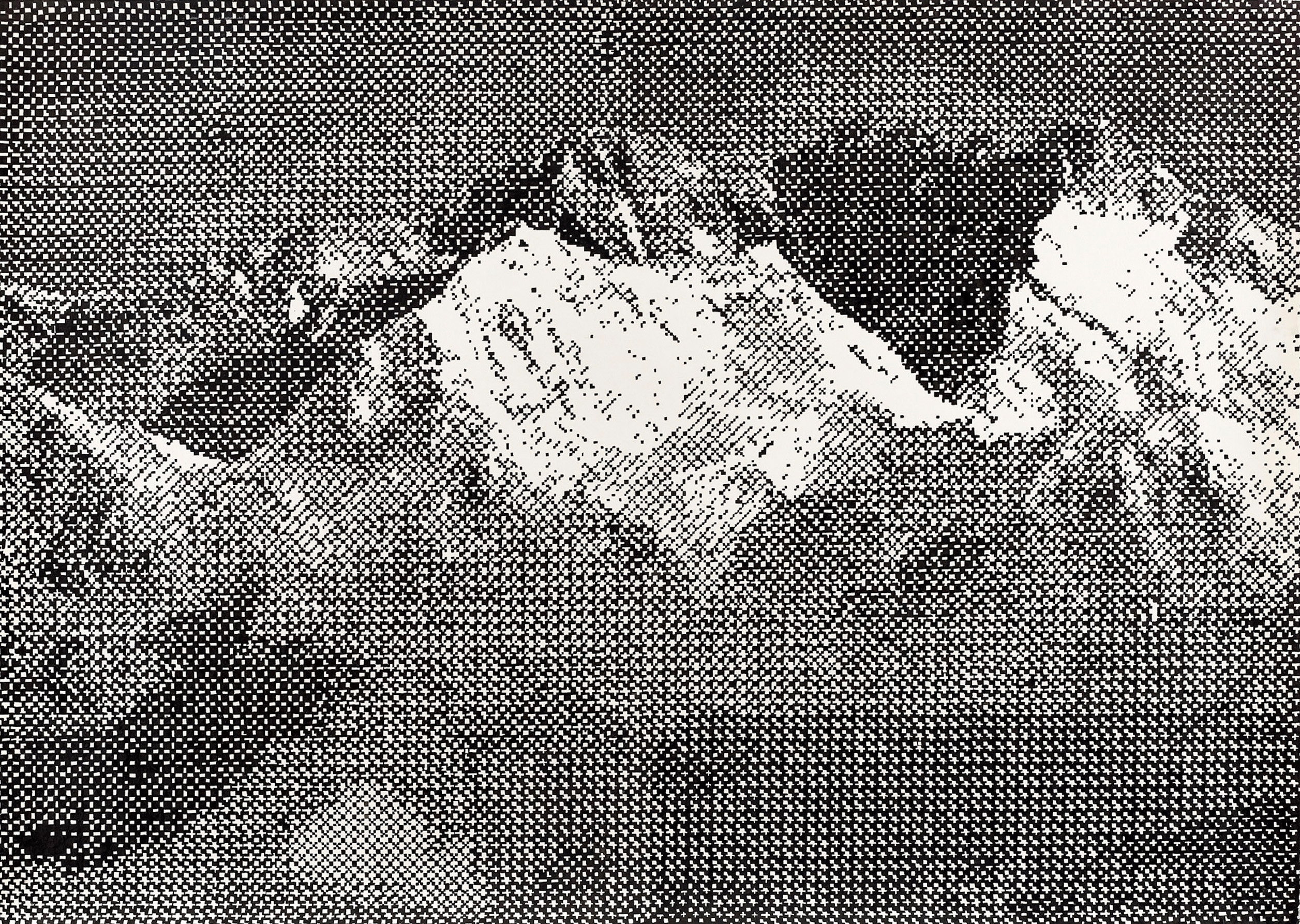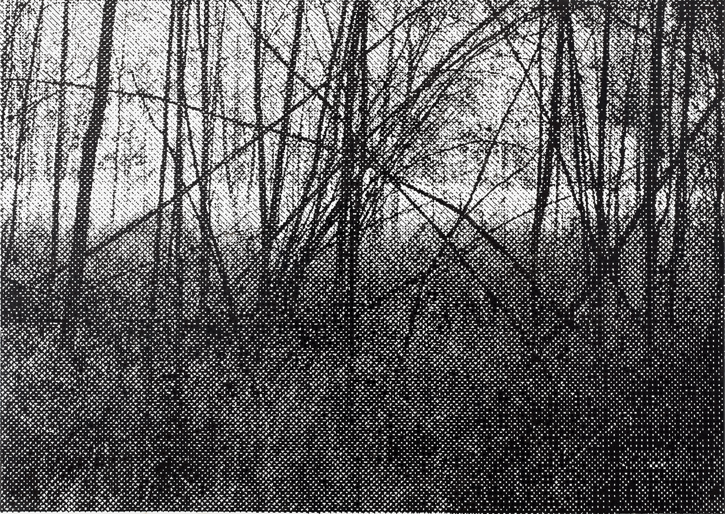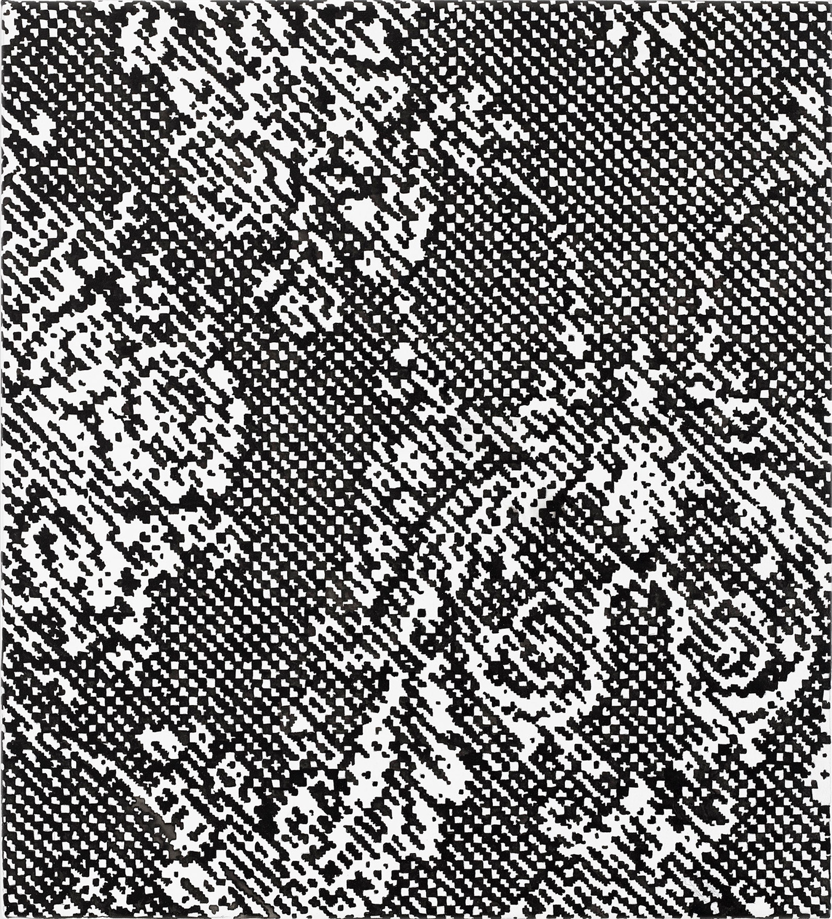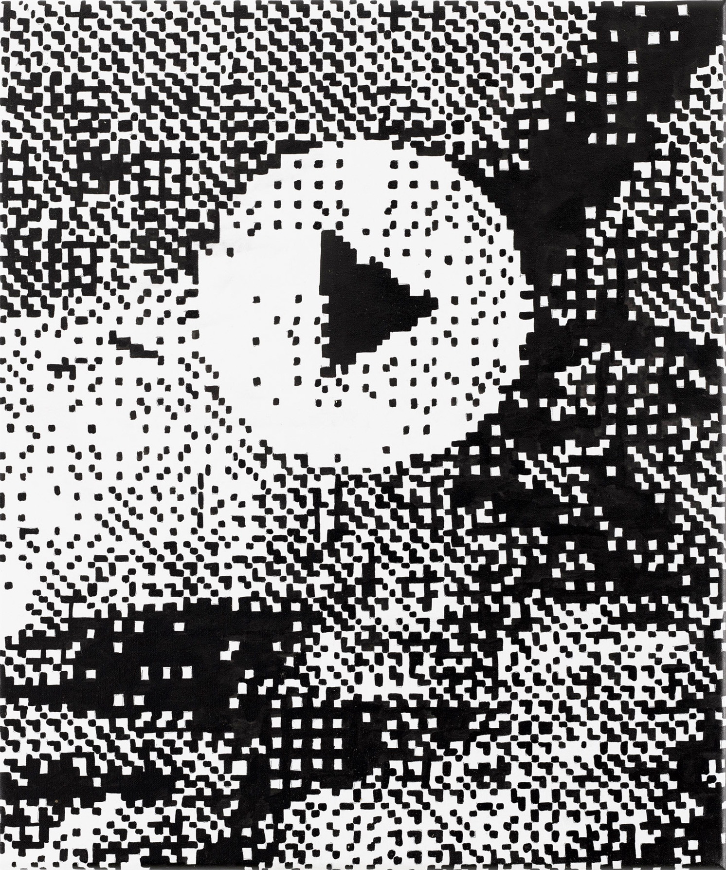The motifs in this series emerge from an intuitive selection process in which digitally sourced templates, shaped by data loss, are converted into halftones—a technique known from offset printing, where shades of gray arise from varying densities of black dots. With meticulous precision, I transfer these patterns onto canvas, pixel by pixel, using Indian ink. Seen up close, the image breaks down into countless fragments; from a distance, it reassembles in the viewer’s eye. Errors and deviations are deliberately left in place, challenging the idea of digital perfection.