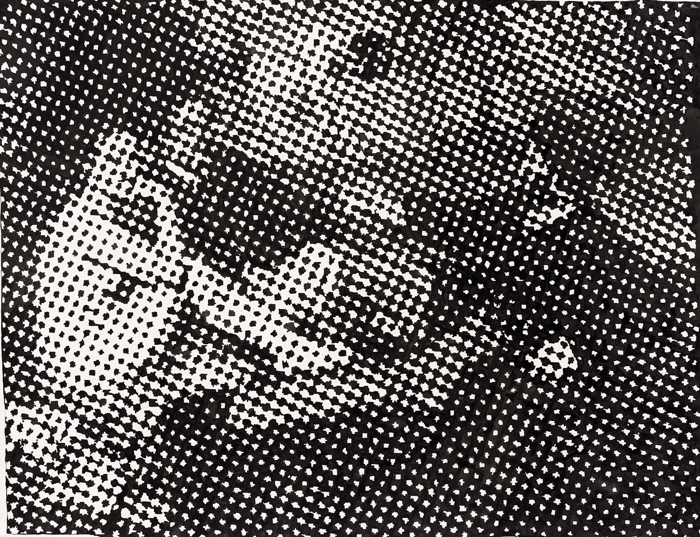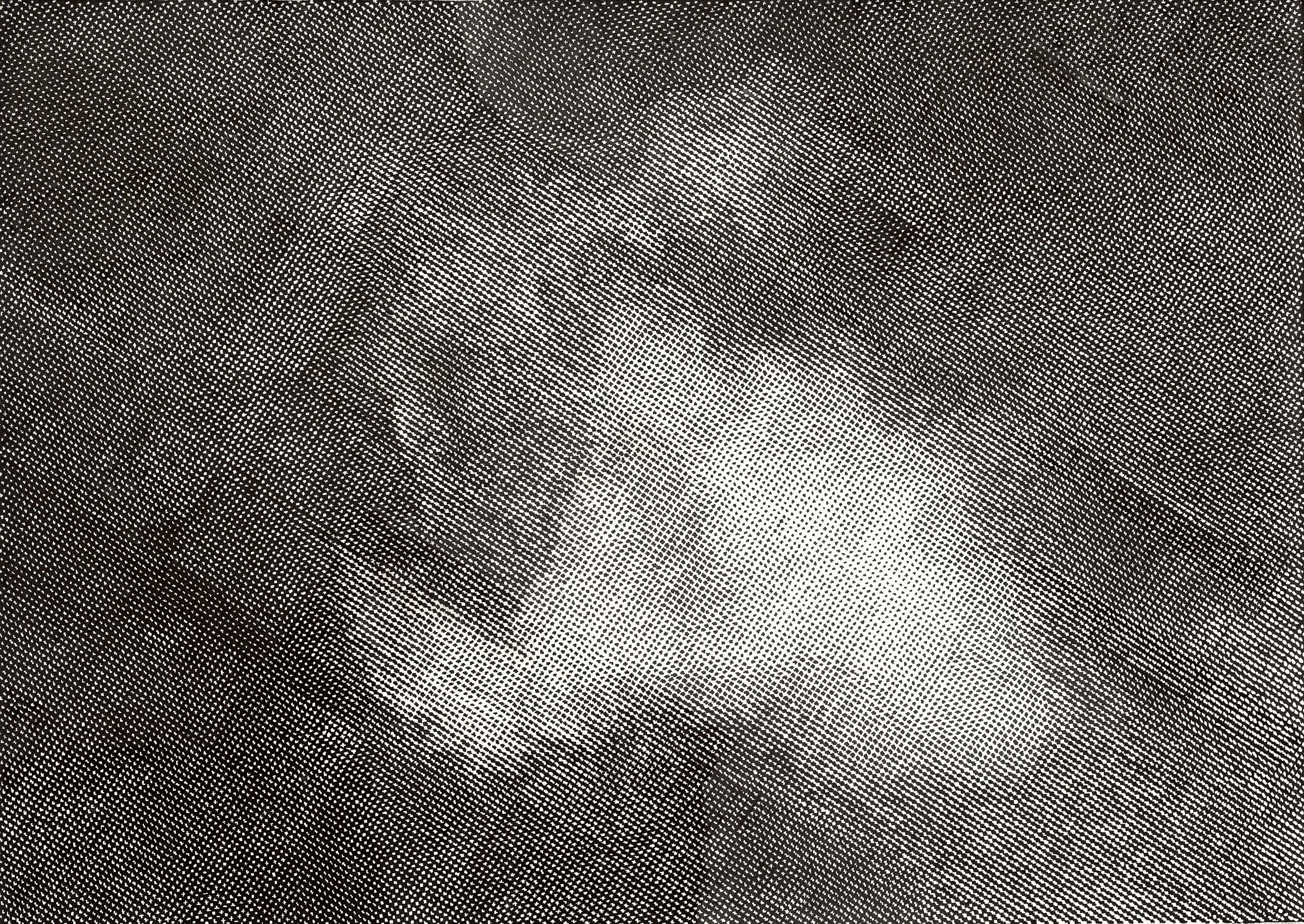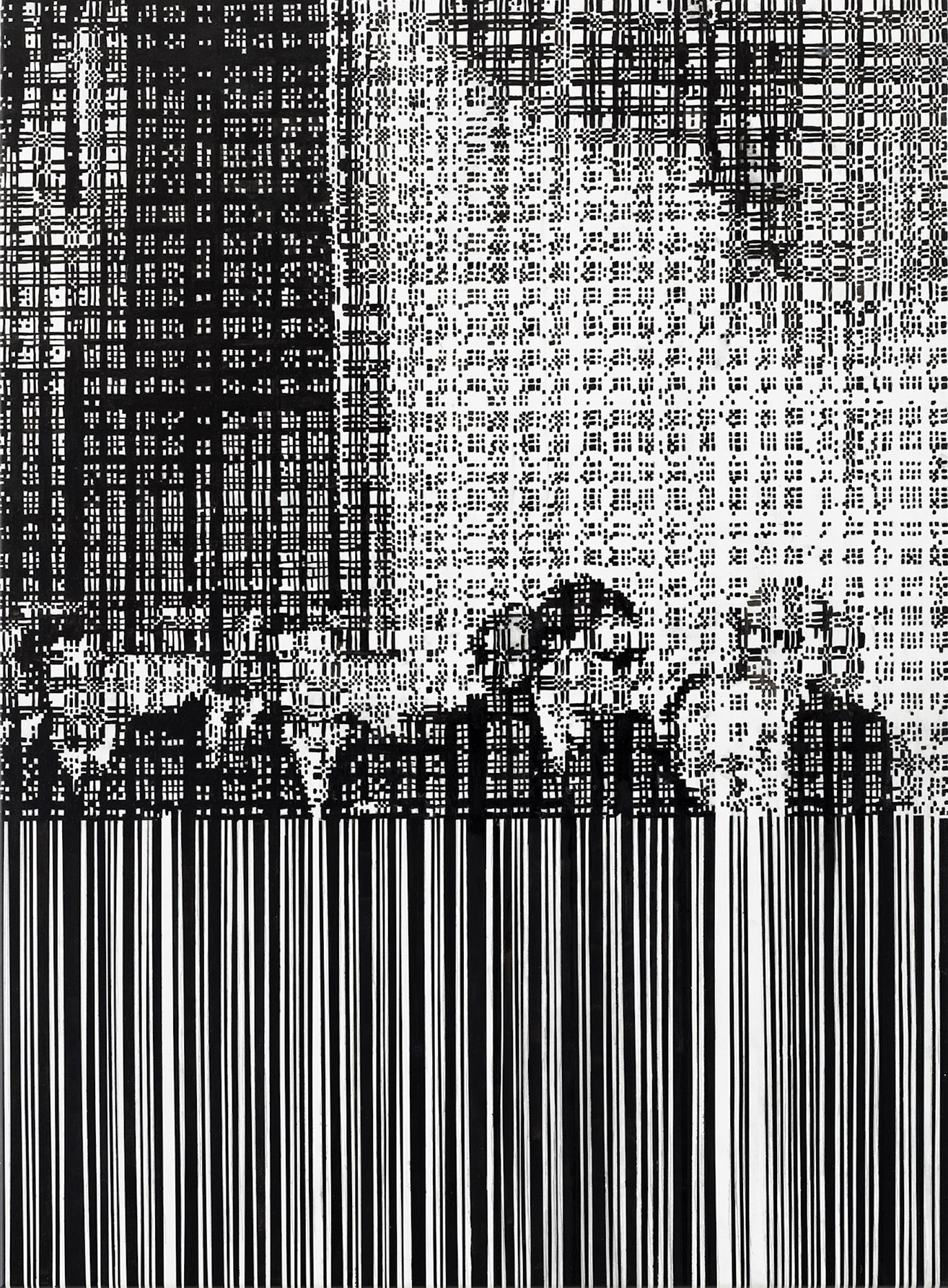 The motifs in this series emerge from an intuitive selection process in which digitally sourced templates, shaped by data loss, are converted into halftones—a technique known from offset printing, where shades of gray arise from varying densities of black dots. With meticulous precision, I transfer these patterns onto canvas, pixel by pixel, using Indian ink. Seen up close, the image breaks down into countless fragments; from a distance, it reassembles in the viewer’s eye. Errors and deviations are deliberately left in place, challenging the idea of digital perfection.