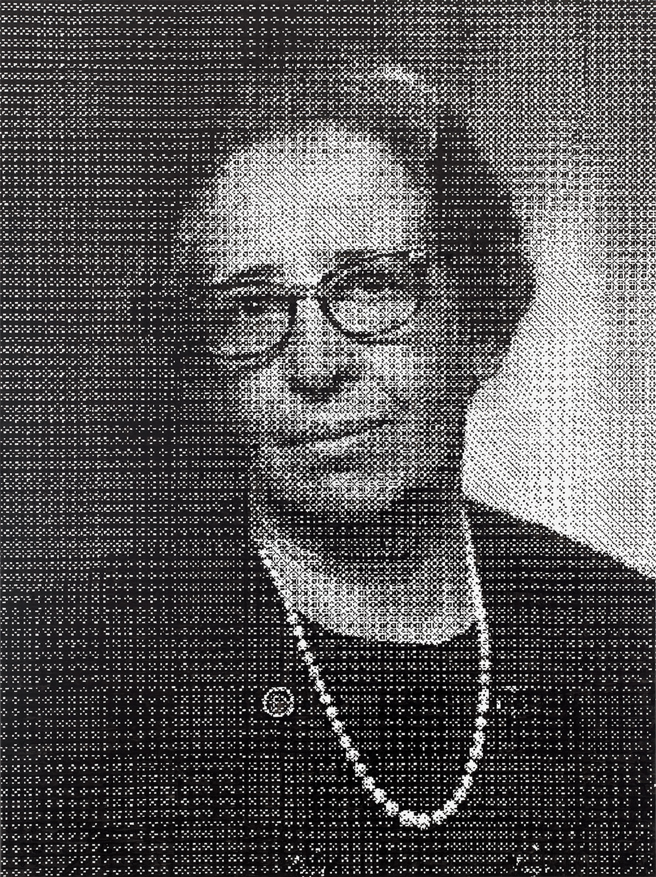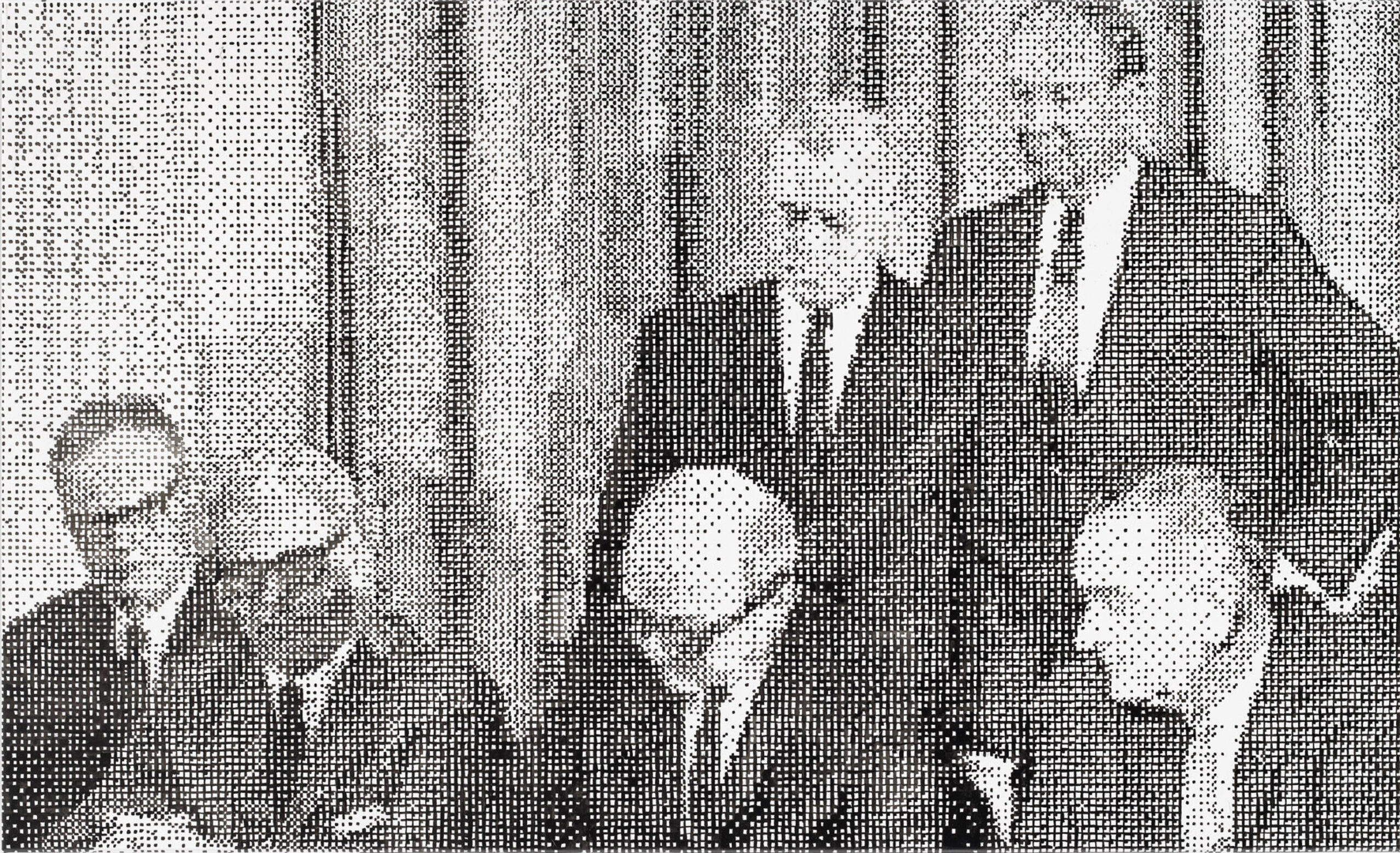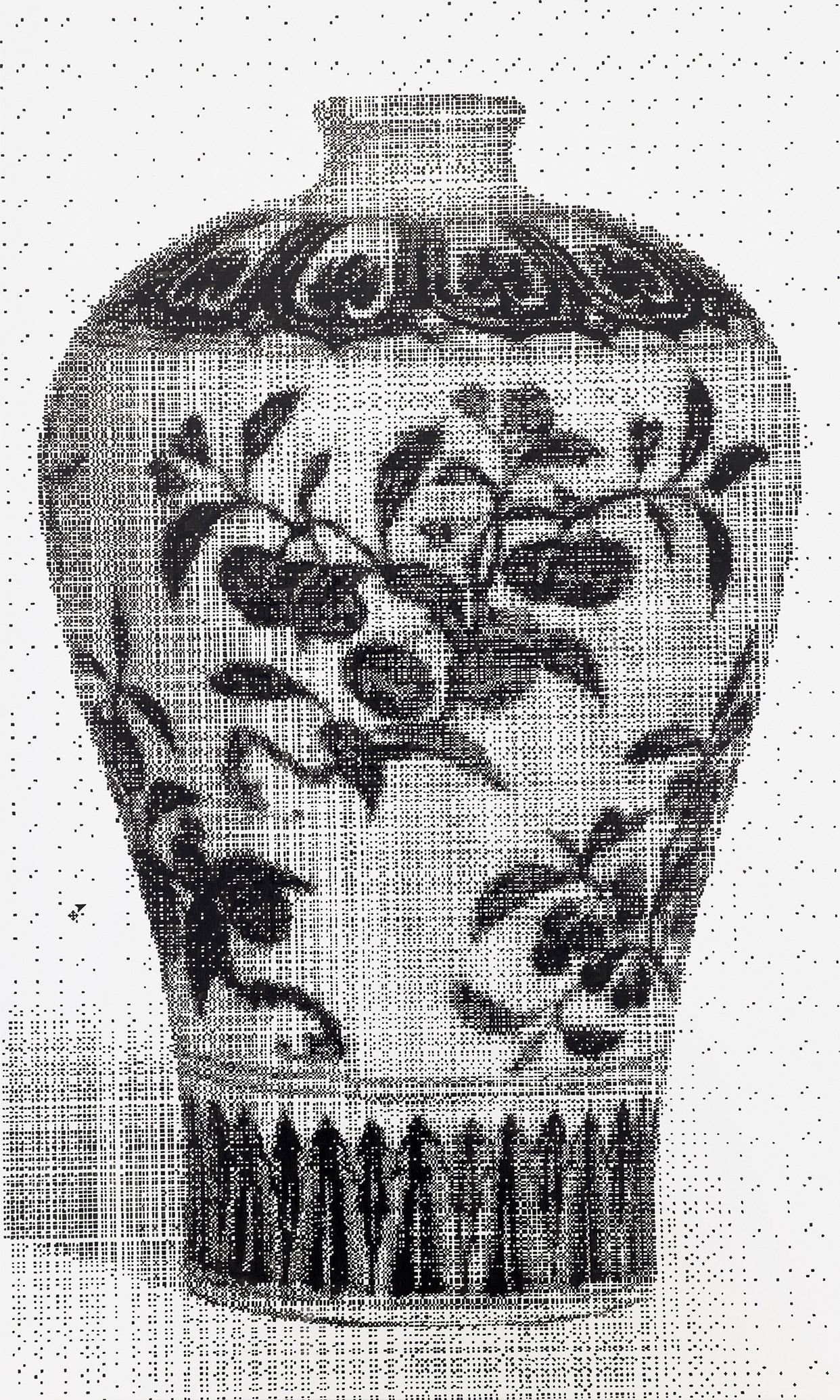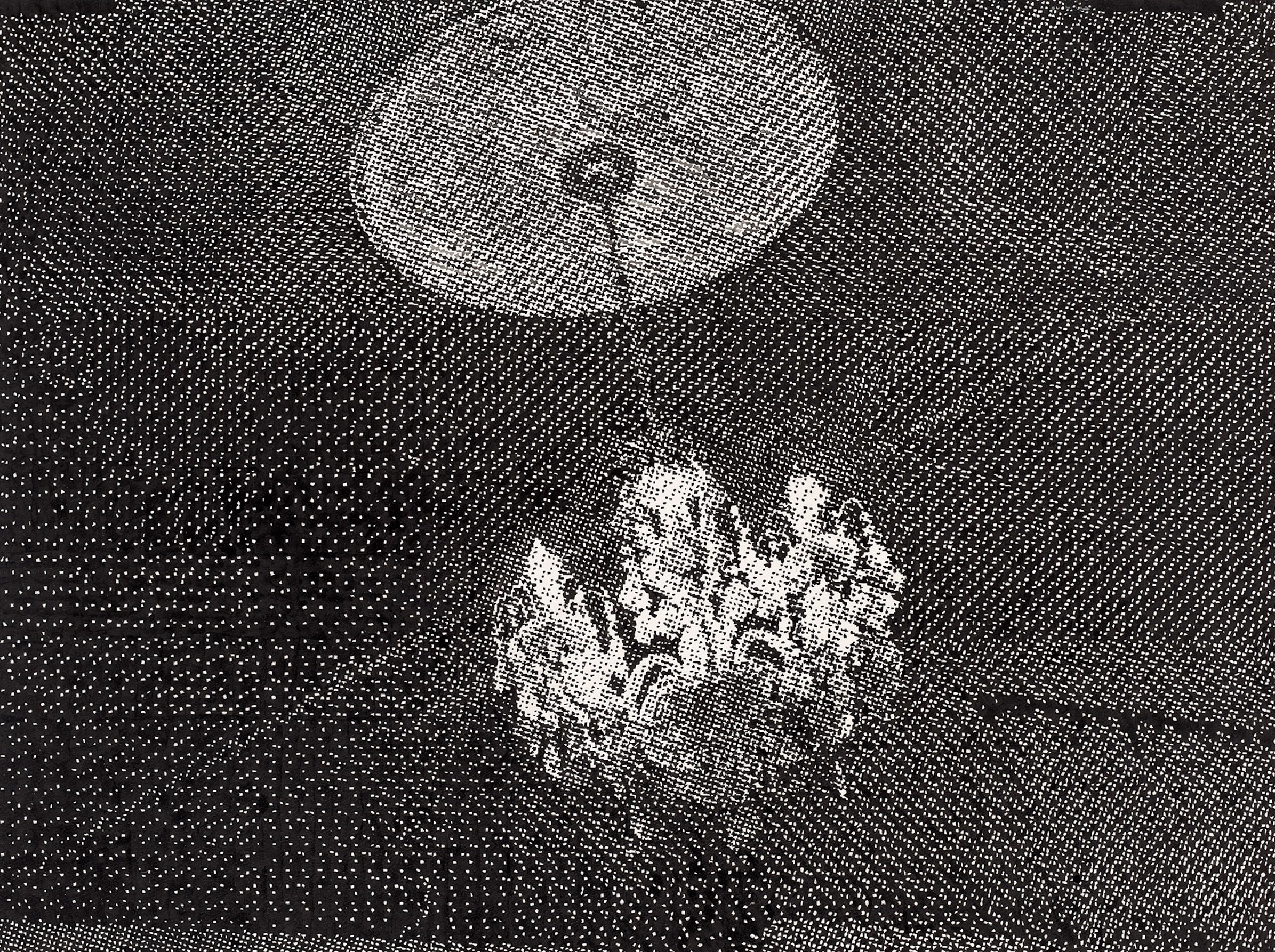 The motifs in this series emerge from an intuitive selection process in which digitally sourced templates, shaped by data loss, are converted into halftones—a technique known from offset printing, where shades of gray arise from varying densities of black dots. With meticulous precision, I transfer these patterns onto canvas, pixel by pixel, using Indian ink. Seen up close, the image breaks down into countless fragments; from a distance, it reassembles in the viewer’s eye. Errors and deviations are deliberately left in place, challenging the idea of digital perfection.